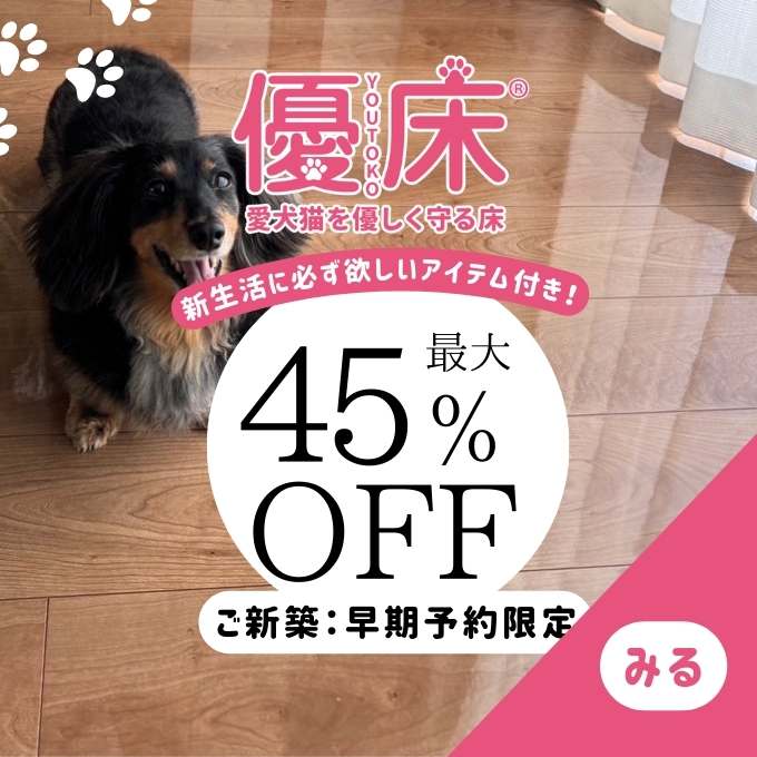 優床のフロアコーティングは、適度な防滑性が得られ、ペットの足腰の負担を大幅に軽減する事が出来ます。ペットの怪我やストレスを防止することから、沢山の愛犬家様から選ばれております!